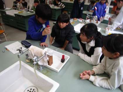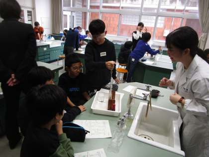 今日は八尾中学校の先生が来校され、理科の授業をしていただきました。色が変わる魔法の薬品を使って、液体を緑色にするミッションに挑戦しましたが、なかなか緑色になりません。中学校では難しい実験をすることを知りました。今回のミッションをクリアできたグループは少なかったですが、協力して実験に取り組む姿が素晴らしかったです。