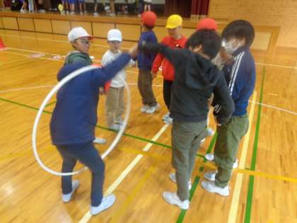 みんなが友達ニコニコ集会2 公開日 2024/12/04 更新日 2024/12/04 委員会活動 「猛獣狩りに行こうよ」では、自分からグループの輪に入ろうとしたり、「こっちだよ。仲間になろう」と声を掛け合ったりしていました。「フラフープくぐり」では、みんなで協力してフラフープをくぐっていました。