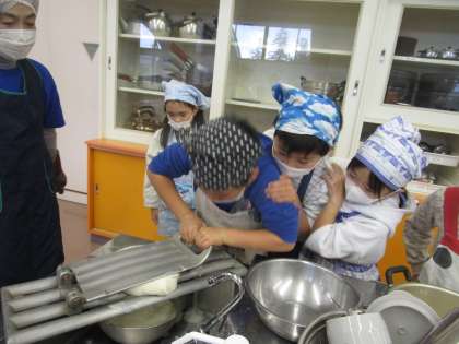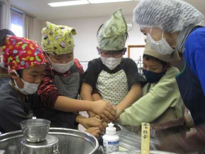 沸騰直前の生呉から、絞り器を使って豆乳を絞り出します。班のみんなと協力して取り組みました。