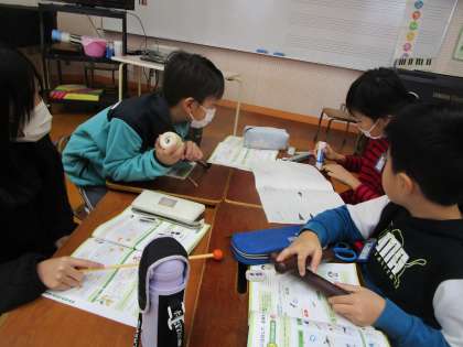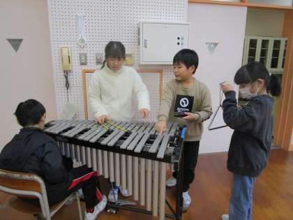 「打楽器の音楽」では、4つのリズムを組み合わせて、曲づくりをしています。どの楽器を選ぶのか、どう組み合わせたらいいのかをグループで音を奏でながら学習してます。