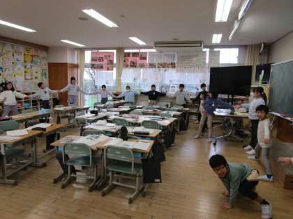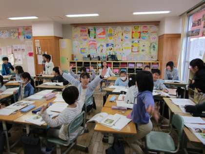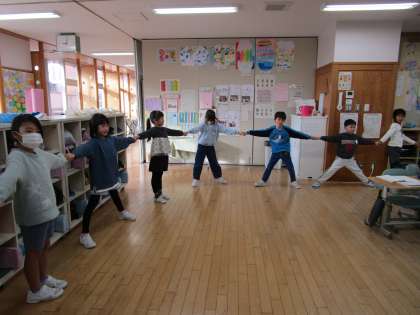 「せかい一の話」という昔話を聞いた後、感想を伝え合い、登場した動物たちの大きさをみんなで想像してみました。最初の大ワシは、腕を上に伸ばして繋いだ大きさぐらい。次の、でかエビは、「教室の大きさぐらいじゃない?」という発言があったので、みんなで手を繋いで教室いっぱいに広がりました。じゃあ、カメは「体育館ぐらい?」「学校全部の大きさかも」。最後に登場したクジラは「杉原いっぱいぐらいかな」「すごい〜」と、ワクワクしながら楽しみました。