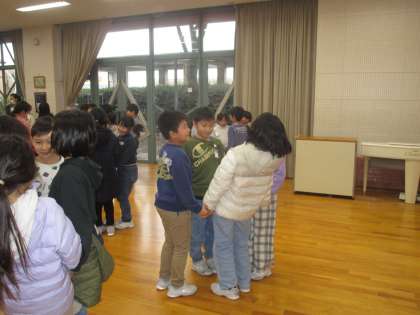 4年生とお楽しみ会 公開日 2024/12/17 更新日 2024/12/17 3年生 4年生とお楽しみ会をしました。「猛獣狩り」や「言うこと一緒、やること一緒」の遊びを通して、4年生との仲も深めることができました。