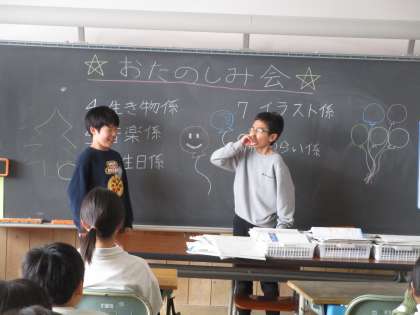 後半は教室と多目的室へ移動し、クイズや椅子取りゲーム等をして楽しみました。最後はお笑い係の漫才で盛り上がりました。自分たちの力でお楽しみ会を運営することができた様子に、成長を感じています。