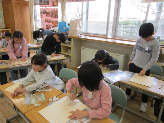 今週から、「たのしくうつして~スチレン版画~」の学習が始まりました。さっそく身近にあるものを使って、スチレンボードに型押しをしました。どの子も楽し走に学習を進めていました。材料の準備のご協力ありがとうございました。