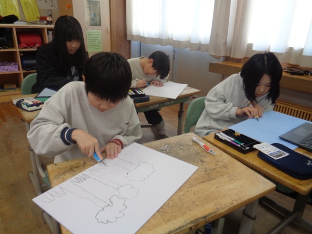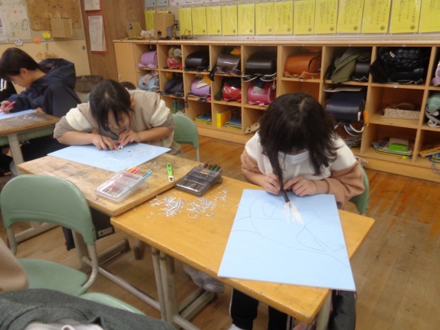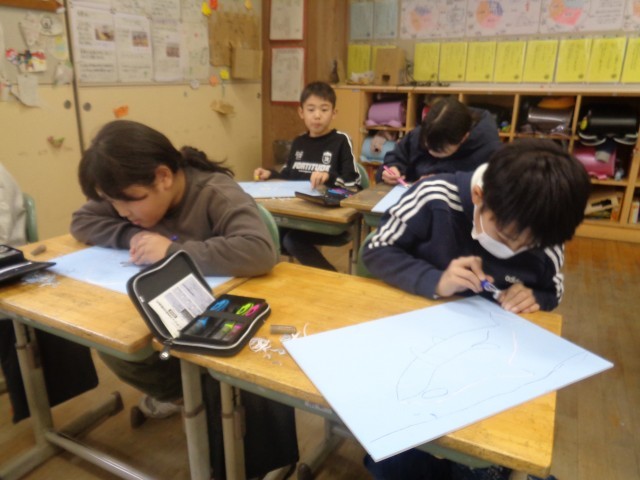 竹組も、彫刻刀で彫り始めました。「彫ったところが白くなる」を合い言葉に、彫るところを友達と確認しながら進めていました。