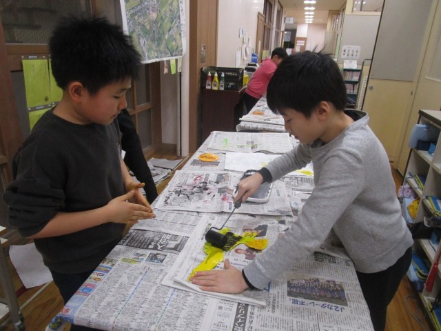「刷り」の作業に入っています。自分のイメージに合うように版の位置を考え、友達と協力して取り組んでいました。