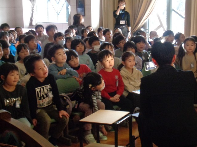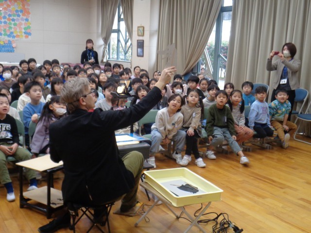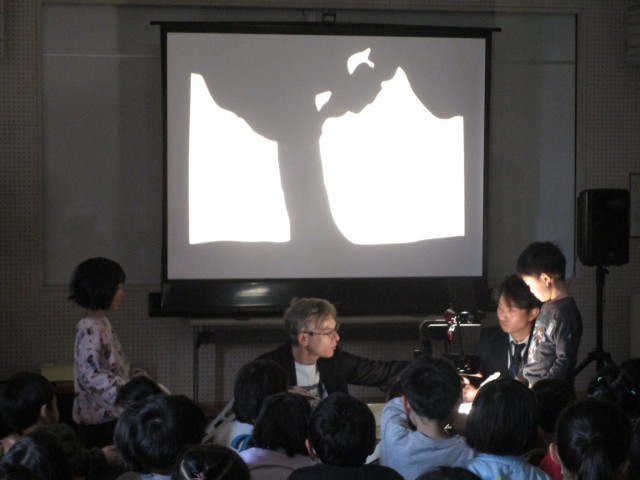 1、2年生は影絵・人形パフォーマーのジャック・リー・ランダルさんの公演を見ました。子供たちの知っている童話や昔話を披露していただき、動く影絵に目を輝かせながら見ていました。