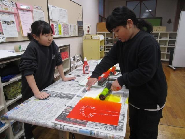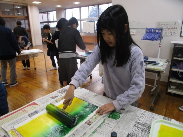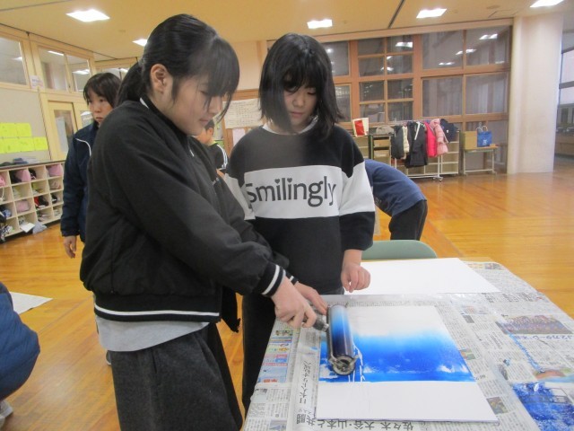 今日は、これまで一生懸命彫り進めてきた版画を刷りました。自分で決めた背景の色をグラデーションで表現しました。友達とそっと紙を置いてずれないようにしたり、インクの量を一緒に確認したりと協力して取り組む姿がすてきでした。
