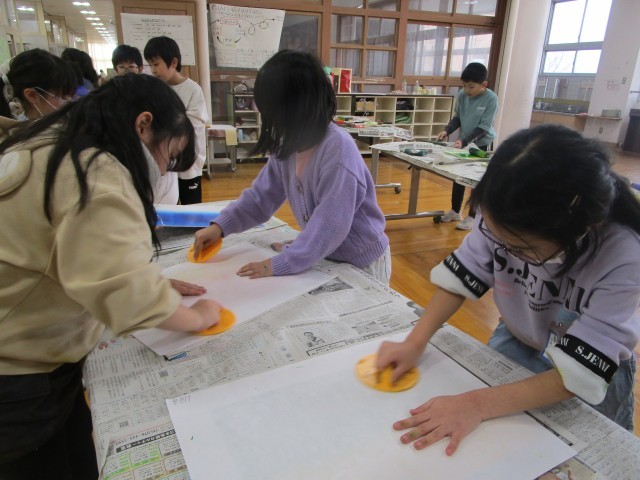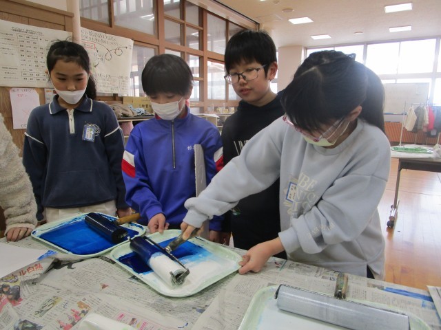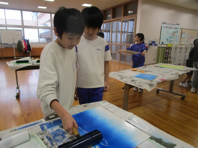 今日は、松組で版画を刷りました。早く終わった人が、みんなの協力隊になって作業がどんどん進んでいきます。「このグラデーションきれいだね」と色の重なりを確認しながら自分の作品がすてきなものになるようにがんばりました。
