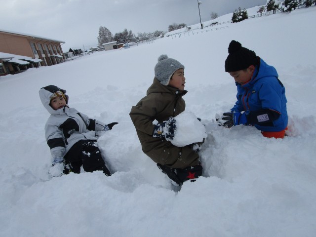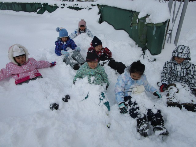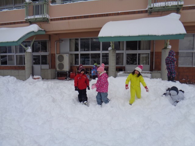 誰も足を踏み入れていない新雪にかけ出す子供たち。「ふかふか」「うもれてしまうね」「さらさらだ」と歓声をあげながら、雪遊びを楽しみました。