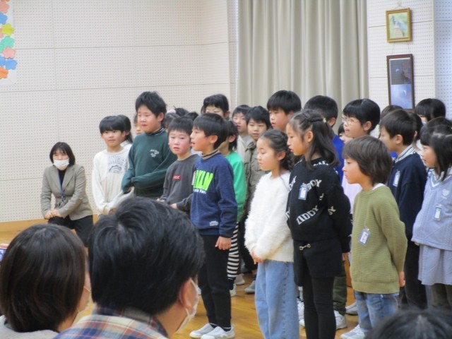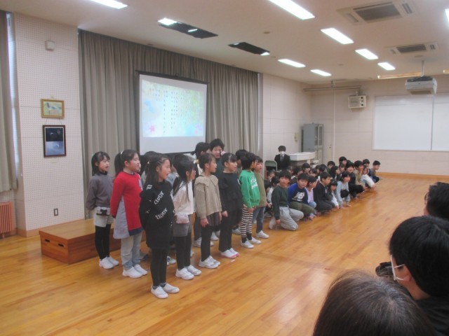 詩の音読では、子供たちがそれぞれ詩を作り、子供たちの中で選ばれた作品を読みました。立つタイミングをそろえることや大きな声で言うことを意識し、これまで練習に取り組んできました。子供たちの中には、休み時間も使って自主的に練習をしている子もいました。本番では堂々と発表でき、満足した様子でした。