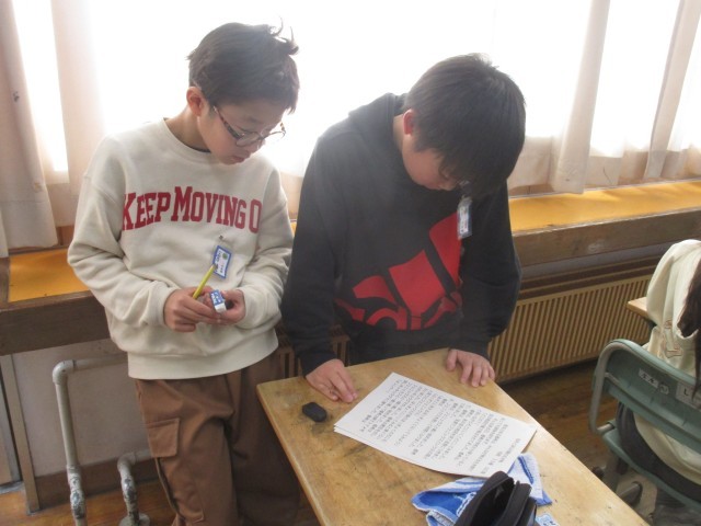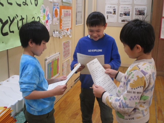 たから島を冒険する物語が完成したので、友達と読み合いました。それぞれ書き表し方が工夫されていて、すてきな学びの時間となりました。