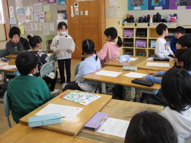 学級の友達の作品をよく見て、よさを見付けることがとても上手になりました。「丸をたくさんつかって模様をつくっているところが、本物の万華鏡みたいでいいなと思いました」「いろいろな色を使っているから、虹のようできれいだなと思いました」など、自分の考えをしっかりもって、友達のよさを語る姿が見られました。