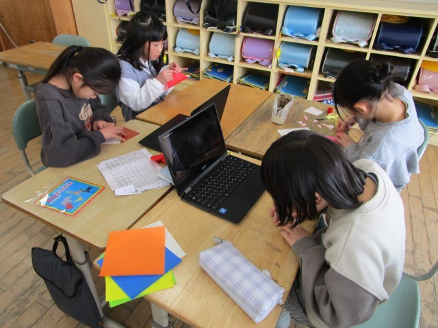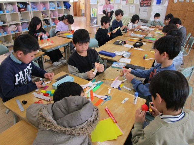 来週の卒業を祝う会で、2年生は体育館の飾りを担当しています。今日は、図工の授業で飾りづくりをしました。折り紙を使って、長い輪っかの飾りや、桜やハートなど、どの子も一生懸命つくっていました。6年生さんが喜んでくれますように。