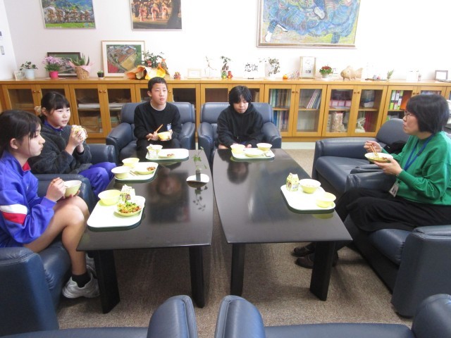 校長室で卒業お祝い会食をしました。ファミリー活動や幼稚園に通っていた頃の話をしながら、校長先生との給食を楽しみました。