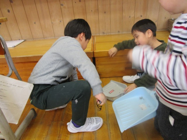のびのびタイムに自分から進んで掃除をしている子供たち。「きれにしたかったから」「友達がしているの見てやりたくなった」と教室をピカピカにしてくれました。綺麗な教室は気持ちがいいですね。