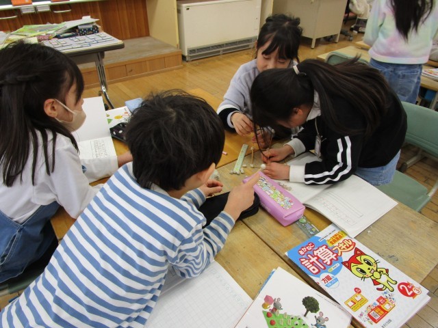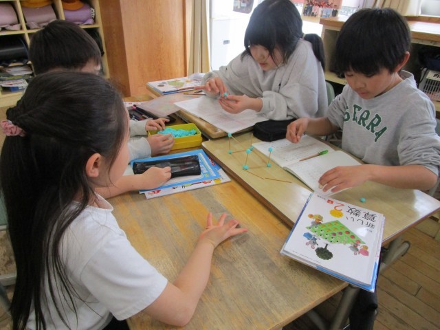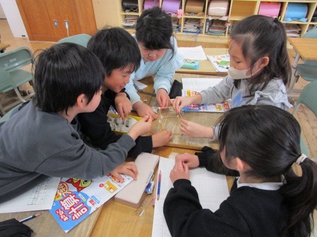 班のみんなと協力して、ひごと粘土玉を用いて箱の形をつくり、辺と頂点を確かめました。