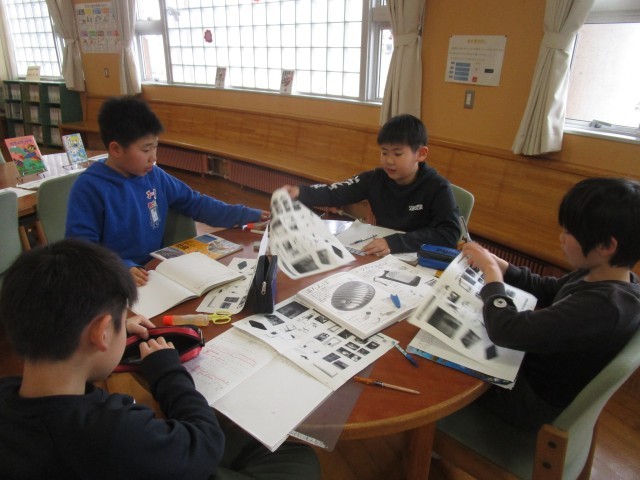 社会科の学習で、道具の移り変わりについて調べています。友達と協力して、本から情報を探していました。