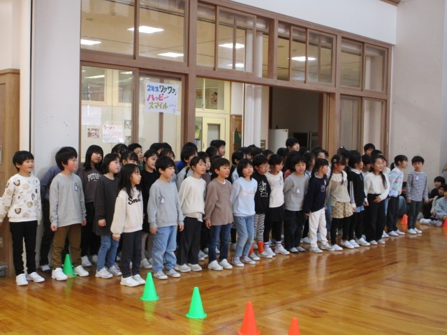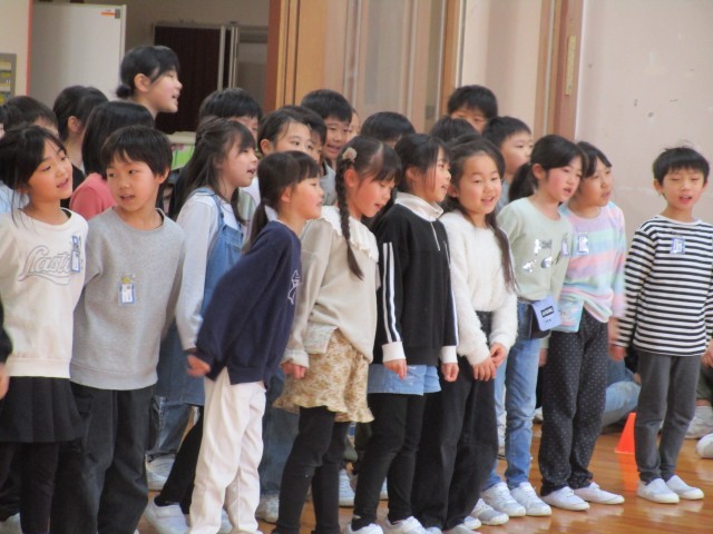 最後は、2年生みんなで「あおい空にえをかこう」を歌い、元気な歌声を全校にとどけました。観ている子供たちからも「えいや」とかけ声が上がり、会場全体が一体となりました。