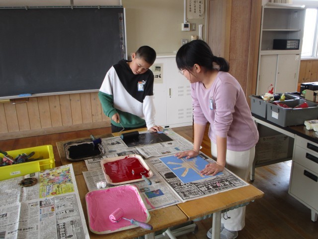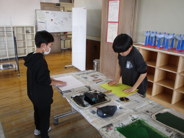 図工の授業では版画を制作中です。今回は「風景画」に挑戦しています。これまでと違い、転写した線を残す部分がある作品になっており、それに伴って彫刻刀で彫る面積が増えました。大変な思いをしながらも、よい作品になるように粘り強く取り組んでいます。