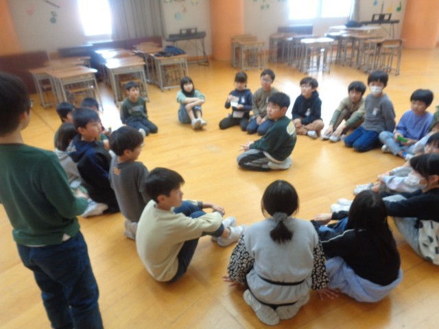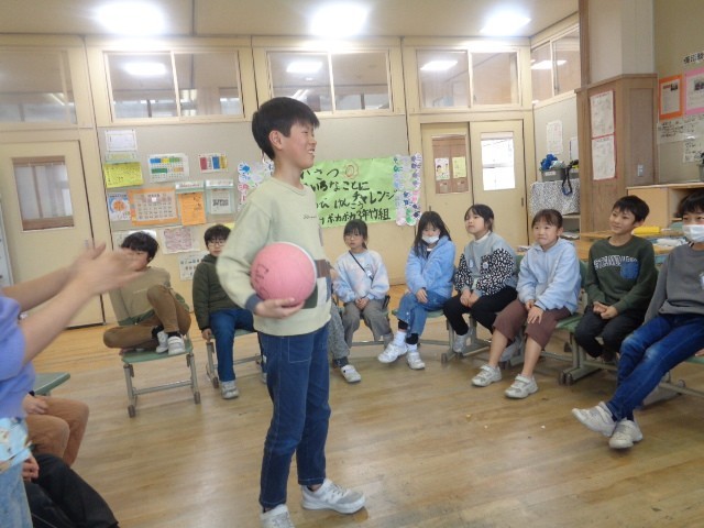 「ありがとうの気持ちを伝え、3竹の思い出に残る楽しい集会にしよう」の目当てのもと、3竹ニコニコハッピー集会を開きました。ばくだんゲームでは、1年間の思い出や感謝の気持ちを伝えたり、だるまさんが転んだやハンカチ落としでは、友達との楽しい思い出を作ったりすることができました。