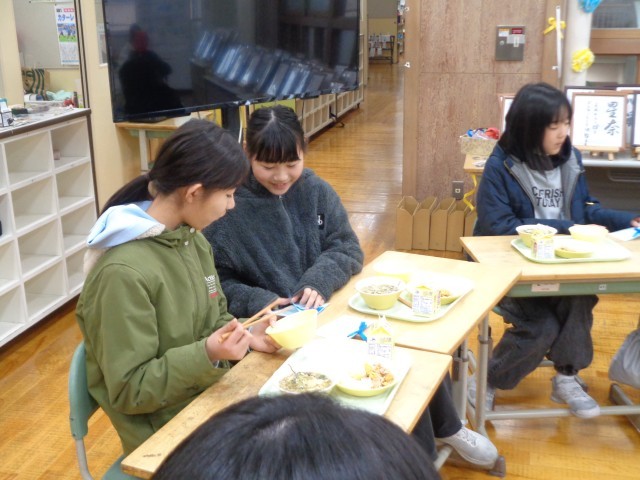 同じ団の仲間からのメッセージを読みながら、おいしく楽しく最後の給食を味わいました。