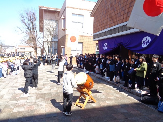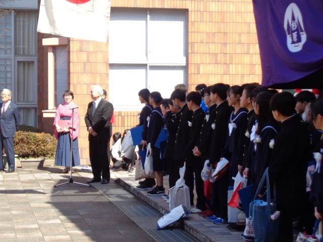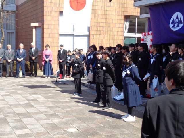 卒業式後の歓送式では、来賓の方、在校生からのお祝いを受けて、地域、学校に向けてエールを送りました。