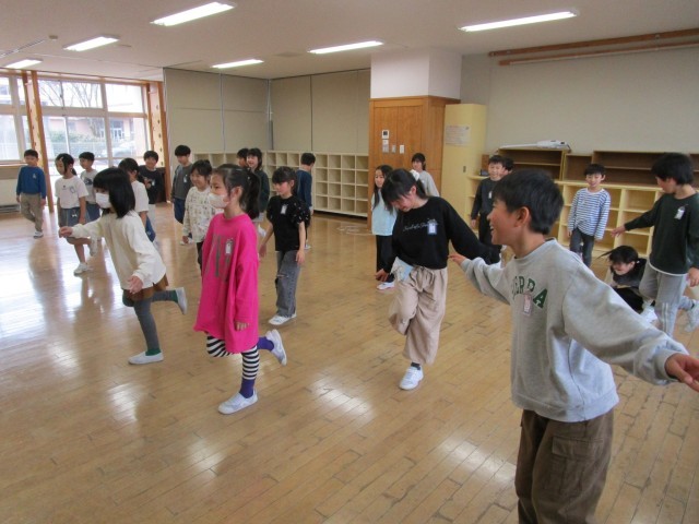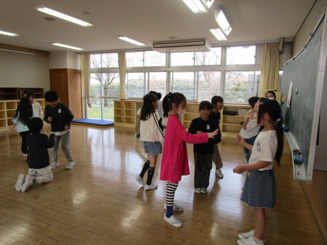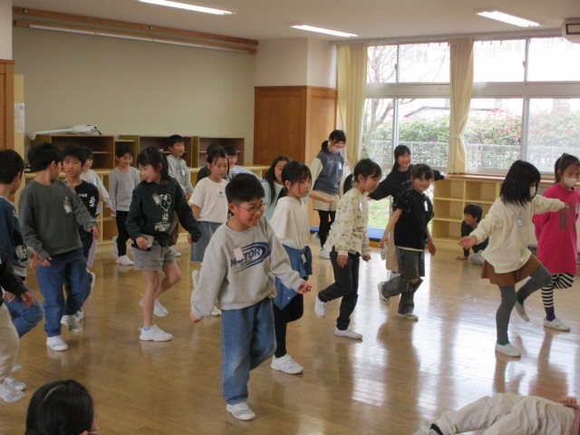 次に1分間片足バランスゲームをすると、多くの子供が最後まで残っていました。その後、クラスの子供が考えたオリジナルルールで、進化じゃんけんをしました。アリが神様に勝つと神様になれるルールがあり、最後は半数の子供が神様に進化していて、ビックリしました。