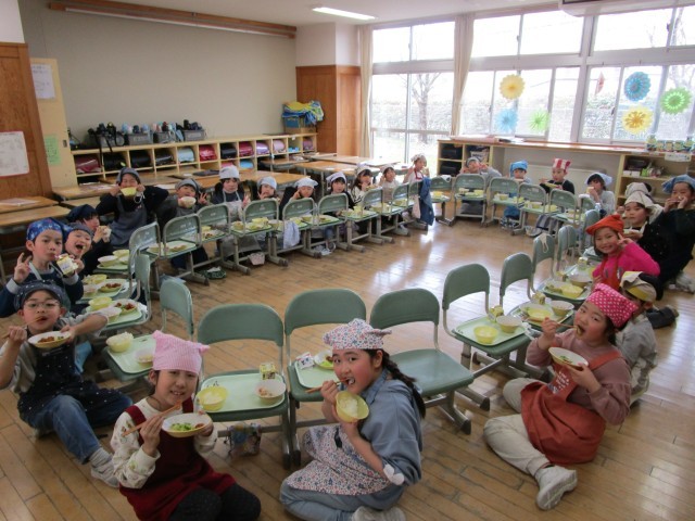 2年生最後の給食は、子供たちの希望で、円になって食べました。感謝の気持ちで「いただきます」「ごちそうさま」の挨拶をし、今日も完食できました。