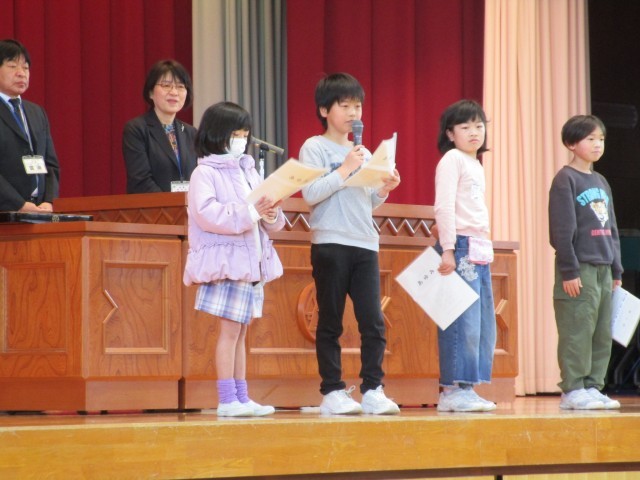 修了式では、学年代表の子供が頑張ったことを一言ずつ話しました。聞いている子供たちも、真剣な眼差しで聞いていました。2年生になって、ぐんぐん成長した子供たち。一人一人の表情に自信が感じられました。