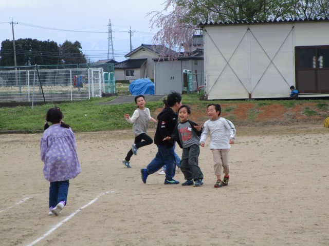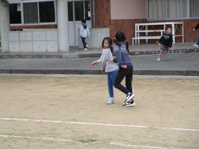 昼休みにグラウンドで思いっきり体を動かしました。みんなで楽しくけいどろをして遊びました。