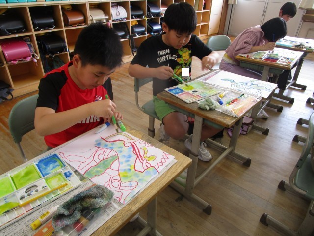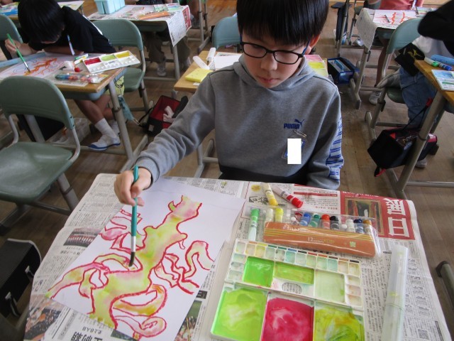 「たらしこみ」という技法を使って、夢に出てくるような木を描きました。色の混ざり方や配色を工夫しました。