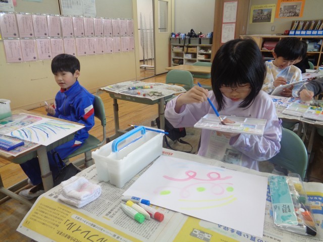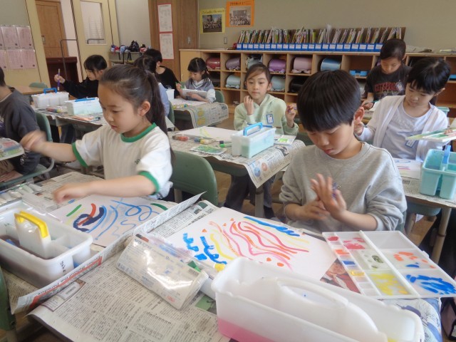 絵の具を使うときの3つのポイントを意識しながら、「いい感じ!」な作品をつくりました。水の量や、筆の動かし方、色の混ぜ方を意識して思い思いに筆を動かしました。