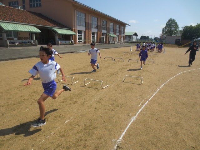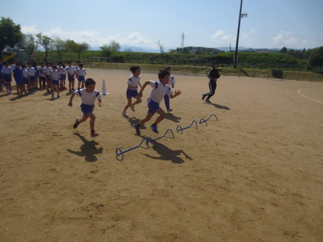 自分の歩幅に合わせてコースを選び、ミニハードルを飛び越えて走る練習をしました。