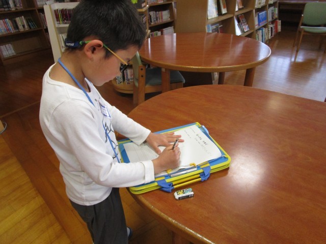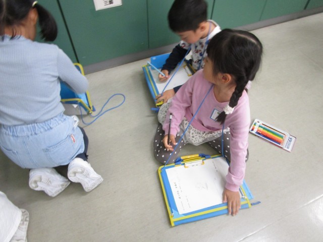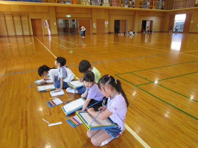 前回の学校探検では、1階から3階までみんなで一緒に探検しました。今回は、1階の自分が行きたい場所を選びました。自分が見付けたものをカードに書きました。真剣に絵を描く姿が素敵でした。