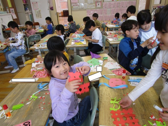 1年生 図工「チョキチョキかざり」 公開日 2025/04/24 更新日 2025/04/24 1年生 折り紙を折り、はさみで切って飾りをつくりました。紙ひもにくっつけ、教室に飾りました。素敵な作品ができあがりました。
