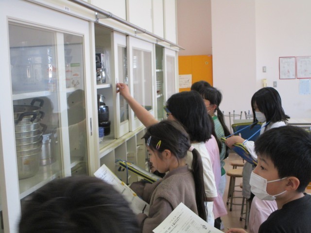 初めて家庭科の学習を実施しました。家庭科室のどこにどんな用具があるのかを探検しました。
