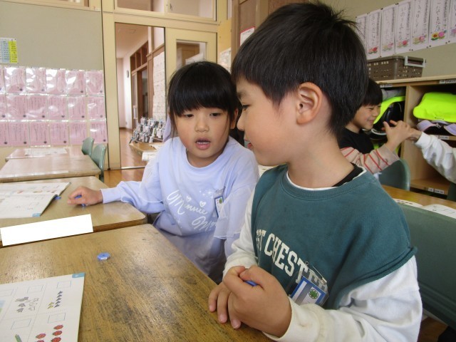 6つのおはじきを使って、いくつのおはじきをかくしているのか当てるゲームをしました。6はいくつといくつに分けることができるかを考えました。