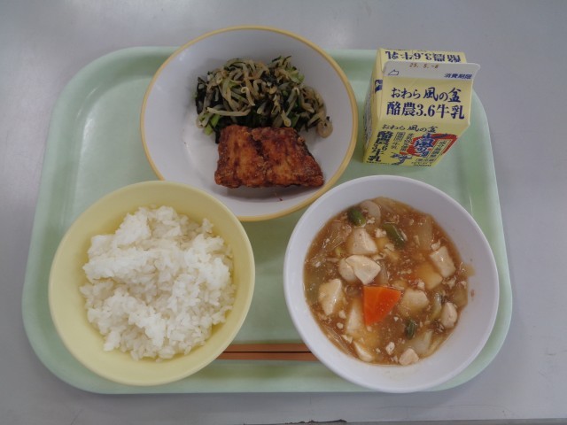 今日は、きざみ海苔がたっぷり入った「磯和え」でした。給食では、よく登場します。今日の野菜は、小松菜ともやしでした。キャベツやチンゲンサイ、ほうれん草等いろいろな野菜でつくる事ができます。磯の風味が広がり、野菜もたっぷり食べることができました。