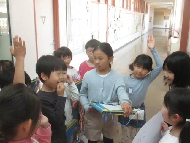 1・2年生は、一緒に校歌を歌った後、学校探検をしながら2年生のつくったクイズを楽しみました。お昼には、再び集まり仲良く一緒に給食を食べました。