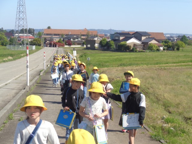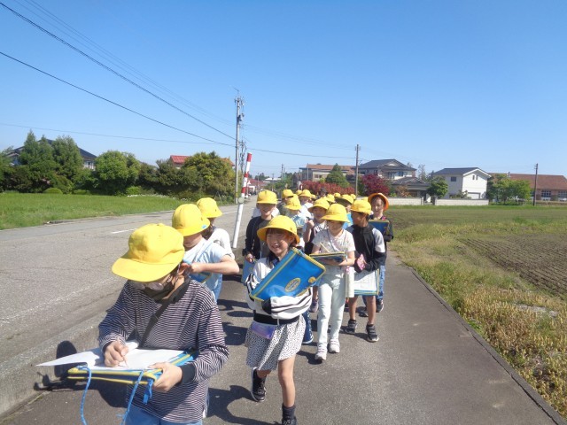 杉原小学校の南側を探検する校外学習に出かけました。先週学習した地図記号を地図に書き込みました。