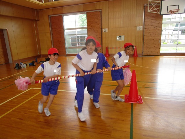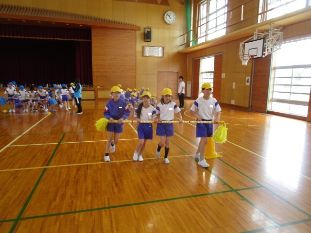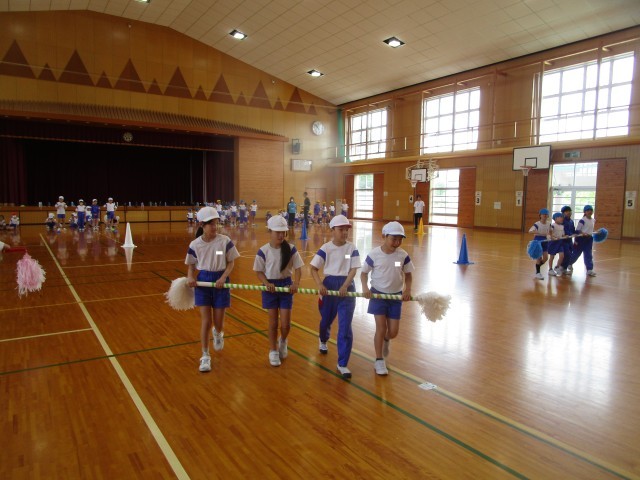 運動会の団体競技練習が始まりました。この競技は、3、4年生が一緒に行います。ルールをみんなで確認し、立ち位置やコーンの周り方を工夫しながら練習しました。