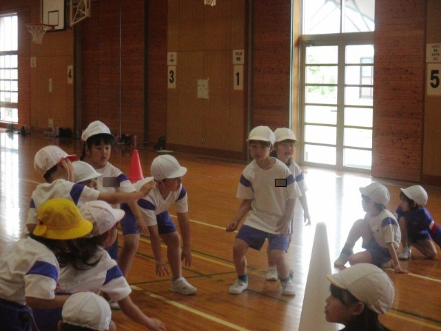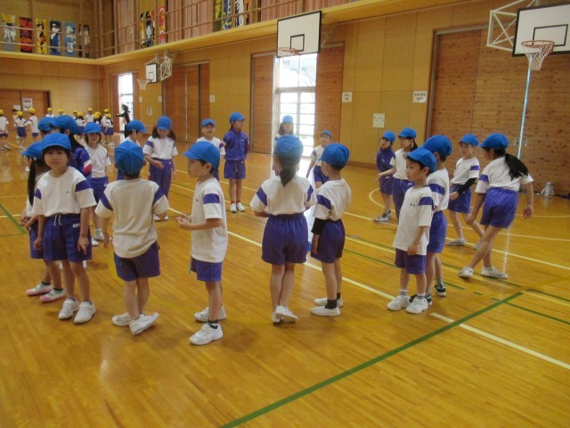 1・2年生合同で玉入れの練習を行いました。1年生は初めての運動会競技に緊張した様子で、2年生は1年生をやさしく教えながら取り組みました。