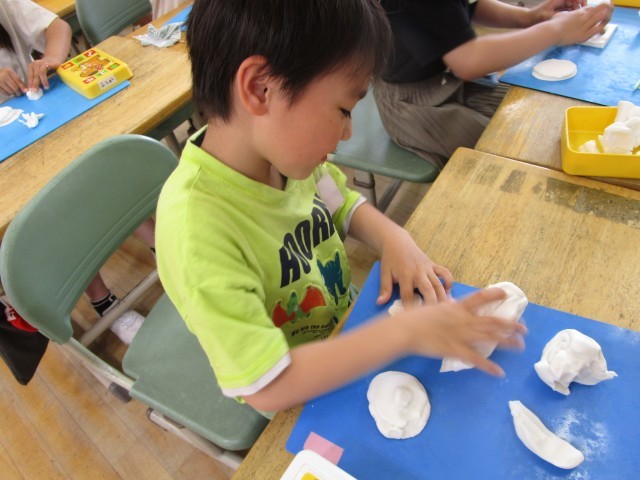 先日、柔らかくした粘土で、自分が思うごちそうをつくりました。ハンバーガー、パンケーキ、そうめん等、美味しい料理がたくさんできました。