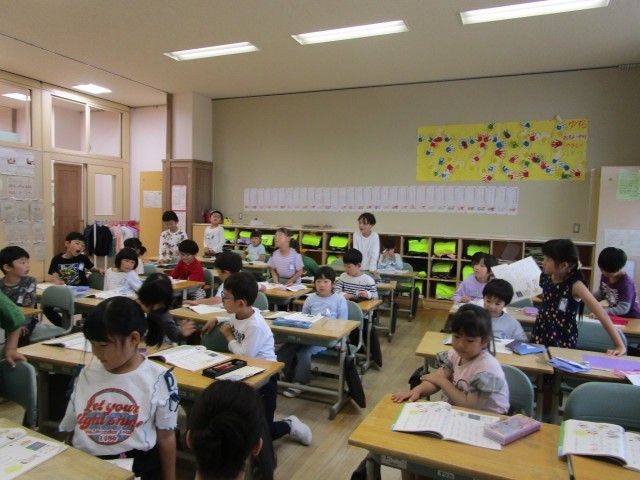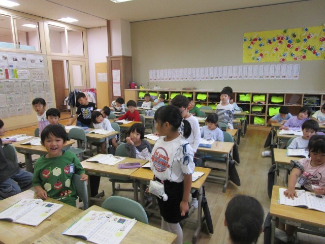 「あいうえおであそぼう」の音読をしました。自分の読みたい場所を3つ決めて、読む場所になると立って音読をしました。はじめは、ゆっくりと行いましたが、最後にはみんなで上手に音読することができました。