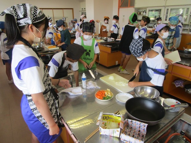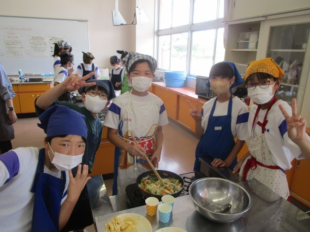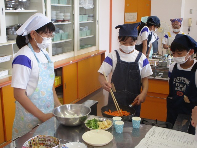 6年生 家庭科 調理実習 公開日 2025/06/04 更新日 2025/06/04 6年生 今日の6年生は、家庭科の授業で調理実習をしました。今日のメニューは「いろどり炒め」です。にんじん、ピーマン、たまねぎ、油揚げを調理しました。食材の切り方や炒める順番に気を付けて、おいしいいろどり炒めをつくることができました。