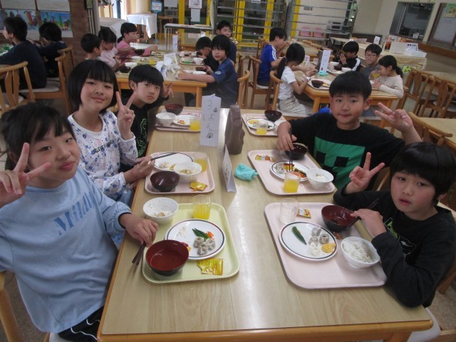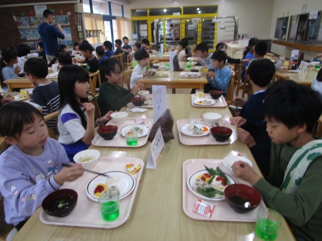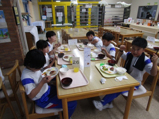 食堂でごはんをいただきました。食事リーダーが中心となって、机の準備や配膳を行いました。もりもり食べ、元気に活動しました。