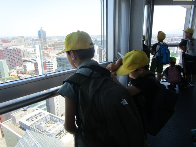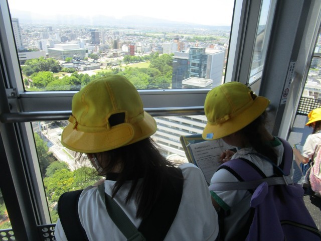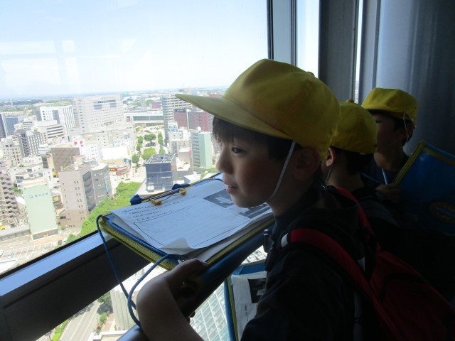 富山市役所展望塔では、地上70mから見る富山市の様子に興味津々な子供たち。方位毎の様子をよく観察し、ワークシートにメモしていました。