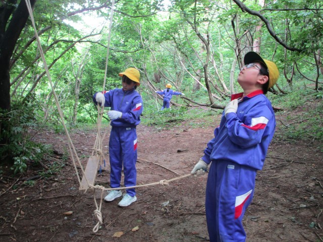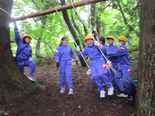 森の中で班のみんなと協力して遊び場を作り、汗びっしょりになるまで遊びました。