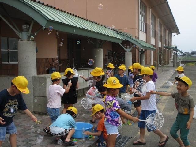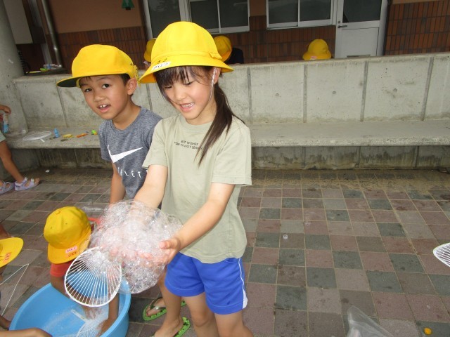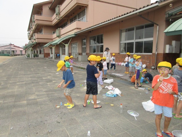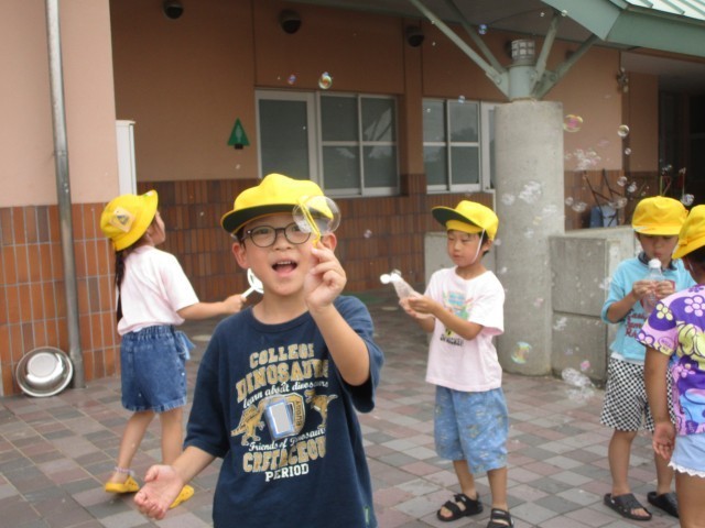 シャボン玉遊びをしました。小さいシャボン玉、大きなシャボン玉、長細いシャボン玉等をつくり、楽しみました。